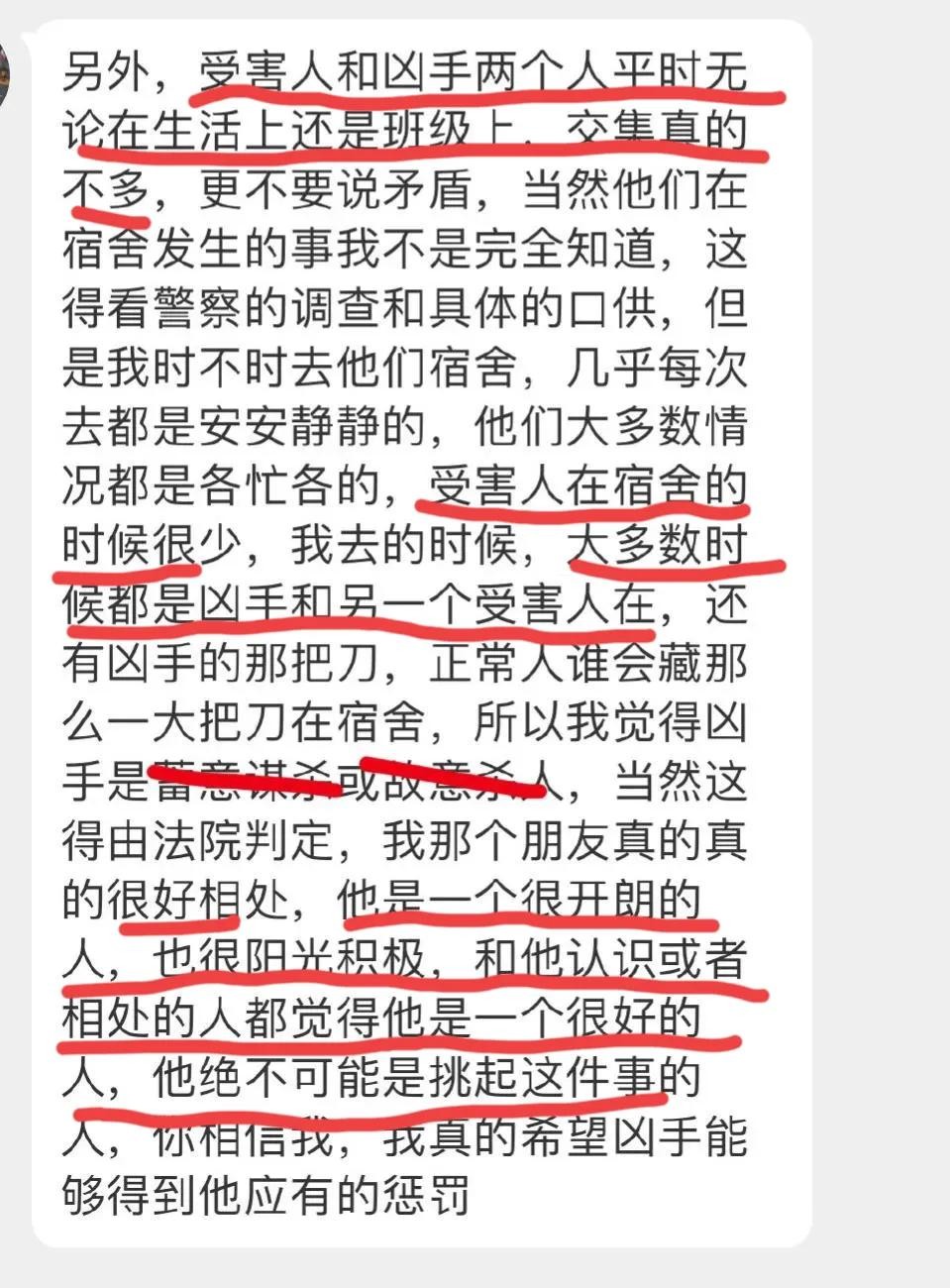 另外,有知情人称:受害人和凶手平时并无交集,并且很少去宿舍,大多数时间基本都是凶手和另一名受伤的同学在。