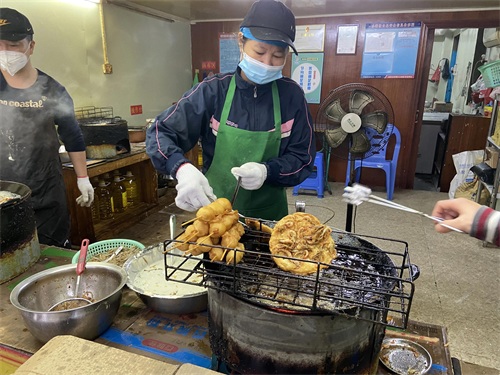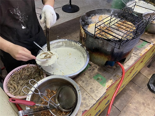 李姨虾饼就是传说中好吃到爆的虾饼,它是老街上的人气摊位,虾饼是用小虾炸制,活蹦乱跳的虾,再蘸上粉浆,落入滚烫的油锅里现炸现吃,口感是属于比较香脆的,能吃到虾的鲜美。店里是两个锅同时炸,但真的属于供应不过来的那种,至少都要排队等5分钟以上。