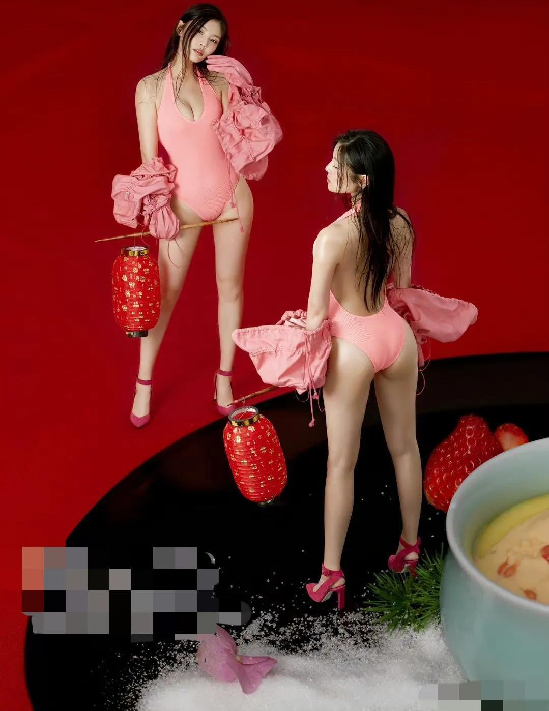 照片中徐冬冬身穿粉色连体泳衣,手拿红灯笼,有种强烈的反差美,同时“大嫂”引以为傲的身体条件也是让人大饱眼福。