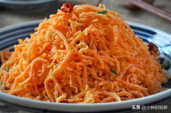 胡萝卜切成细丝或者直接擦成细丝,胡萝卜丝里加入适量的植物油搅拌均匀,这样可以防止后续拌面粉粘连。胡萝卜丝里再加入50克的玉米面粉抖拌均匀,再加入50克的面粉抖拌均匀,让每一根胡萝卜丝上都沾满面粉和玉米面粉。然后将胡萝卜丝铺在蒸锅的篦子上,水烧开后上锅蒸5分钟出锅;将胡萝卜丝倒入碗中用筷子抖散待用。再胡萝卜丝上撒上葱花和蒜末,浇上热油激发出香味,最后撒上适量的食盐拌匀既可以食用了,营养又美味,大家可以试一试。