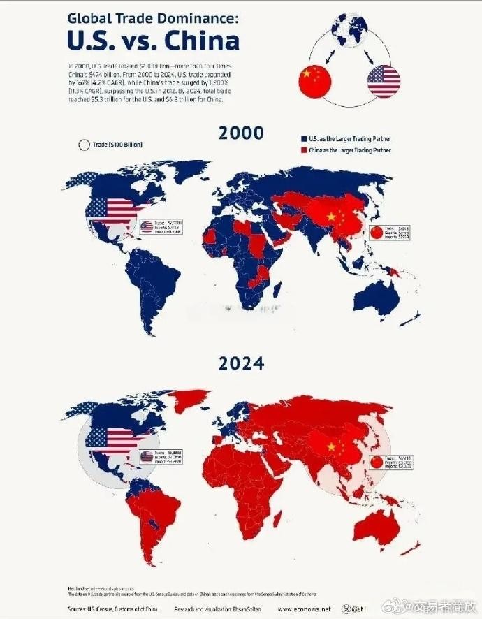 如果以贸易主导地位来计算,也就是和中国贸易额高标记为红,和美国贸易额高标记为蓝,那么几乎整个地球都已经是红的了。