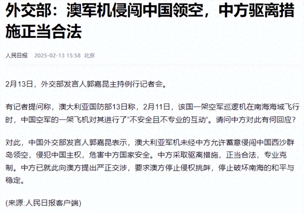2月13日,澳大利亚国防部发表声明,称中国空军的一架飞机对澳洲空军的飞机进行了“不安全且不专业的互动”。