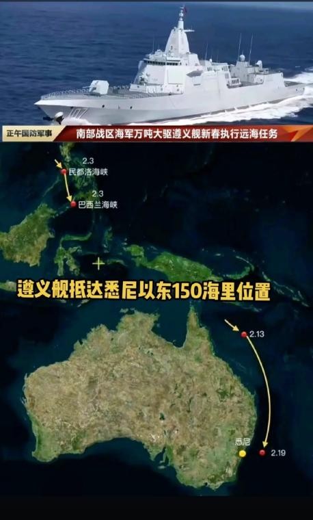 2月19日上午,中国遵义舰编队抵达了澳大利亚最大城市悉尼附近,距离悉尼150海里,射程覆盖的城市占了整个澳大利亚70%GDP。