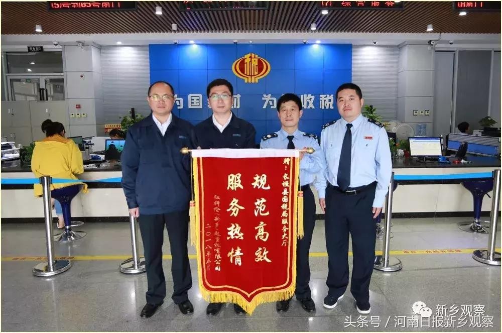纽克伦公司负责人将一面锦旗送到长垣县办税服务厅,对他们提供的优质服务表示感谢。王怡平 摄