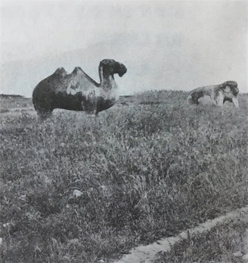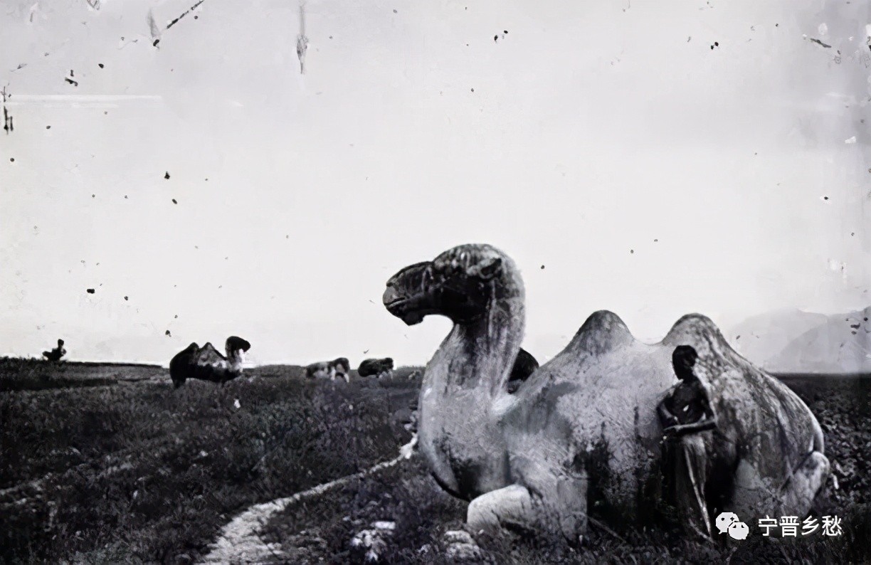 清末照片,站在石雕骆驼旁边的少年。
