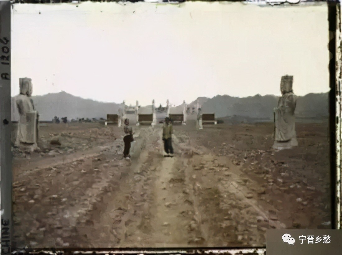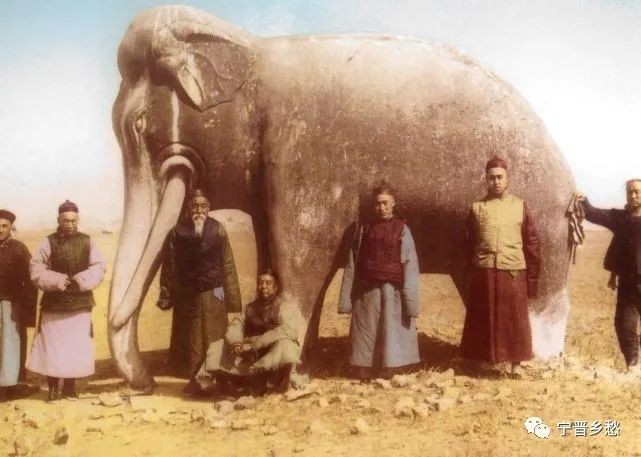 清末,在十三陵神道石像旁合影的男子。