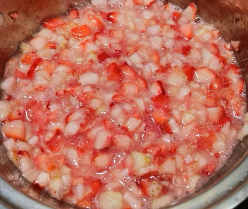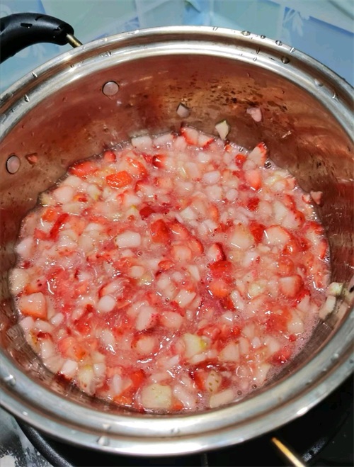 3、将腌制好的草莓连同糖水一起倒入锅中,大火煮沸,再用小火慢慢熬煮,期间不断搅拌以防止粘锅。