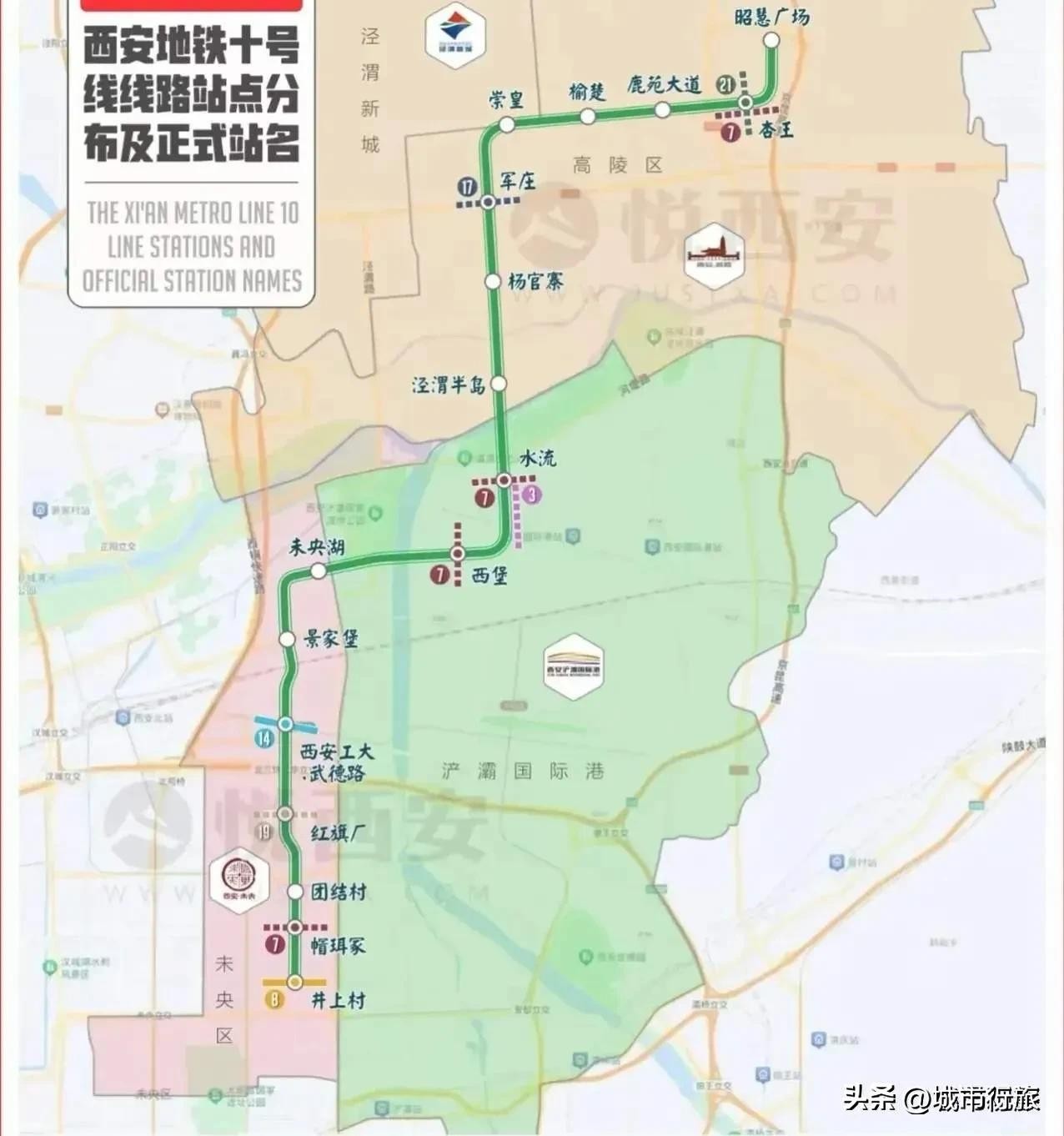 根据西安地铁10号线的线路图可以看出,线路南起井上村,北抵高陵昭慧广场,线路全长34.2公里,沿途有帽珥冢、团结村、红旗厂、西安工大武德路、景家堡、未央湖、西堡、水流、泾渭半岛、杨官寨、军庄、崇皇、榆楚、鹿苑大道、杏王、昭慧广场等17个站点。