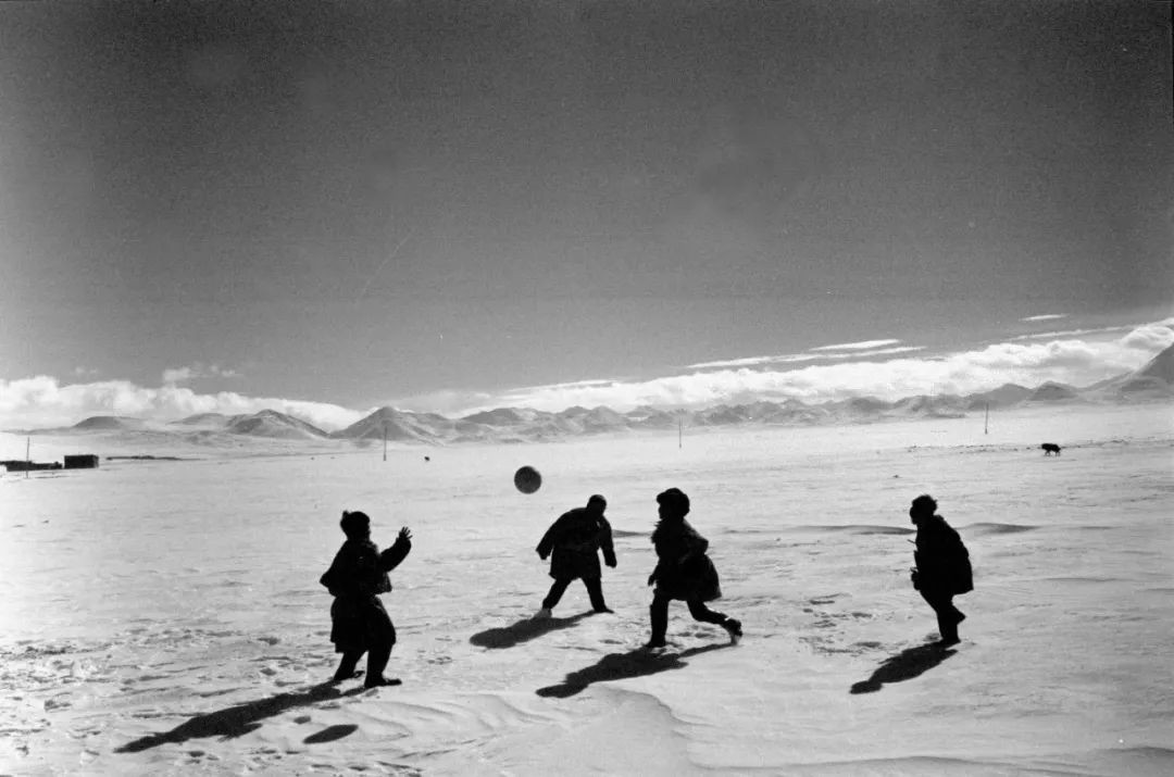 西藏纳木错湖边的孩子们在雪地上踢足球(1990年摄)。新华社发