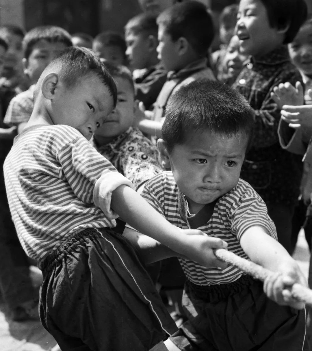 河南三门峡市幼儿园的孩子们参加一场拔河比赛(1978年5月摄)。新华社发