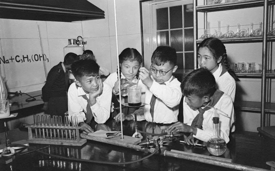 中国福利会少年宫科学部化工小组的少年儿童队员们正在制造肥皂的实验(1953年摄)。杨溥涛 摄