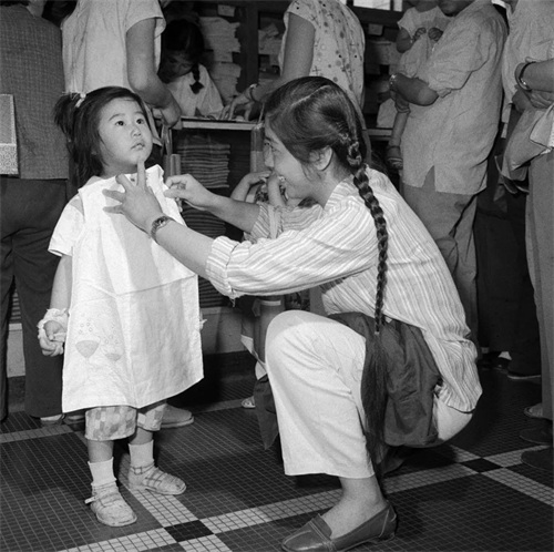 “六一”前夕,北京王府井百货商店童装组十分热闹。一位妈妈正在为女儿试穿新买的裙子(1964年摄)。新华社发(资料照片)