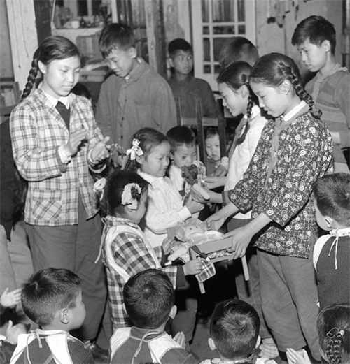 为了迎接“六一”儿童节,上海市实验小学掀起了千件玩具送弟妹的活动。图为他们把自己制作的一批玩具,赠送给上海万竹街托儿所的小朋友(1960年5月摄)。新华社记者 赵成 摄