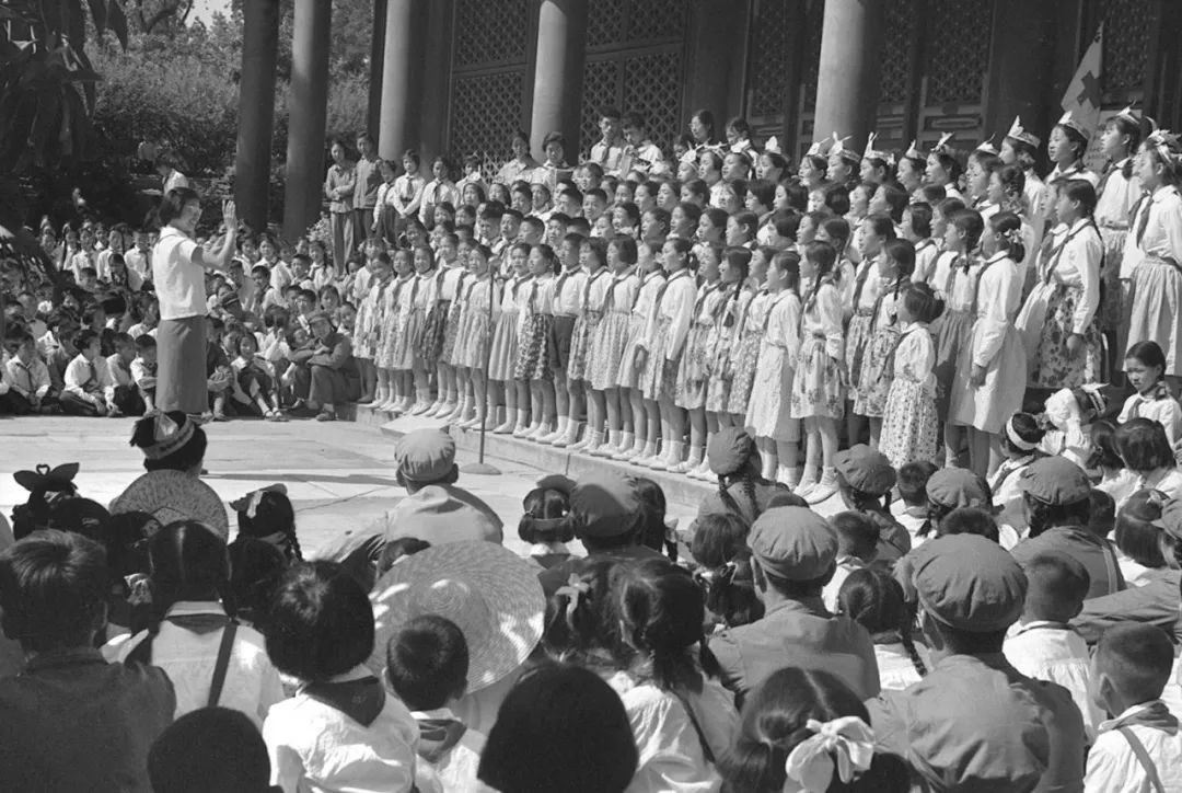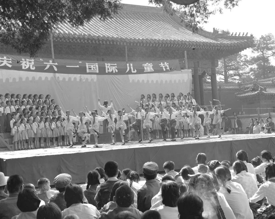 首都少年儿童和中国人民解放军战士在颐和园联欢,欢度“六一”国际儿童节。图为儿童正在演出诗歌联唱(1966年6月1日摄)。新华社记者 郑书福 摄