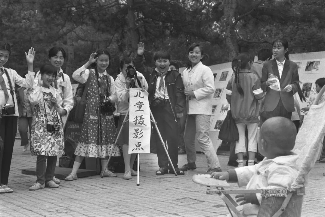 在北京日坛公园举行的儿童节大型游园会上,北京三里屯第三小学的学生开设了“儿童摄影点”,为游园的小朋友拍纪念照(1991年5月29日摄)。新华社记者 张旭 摄