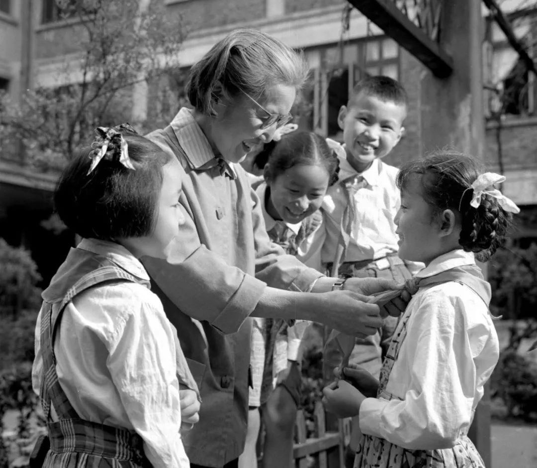 “六一”儿童节,上海实验小学副校长,60岁老教师蒋师昭向二年级的刚入队的队员们祝贺(1963年摄)。新华社记者 王子瑾 摄
