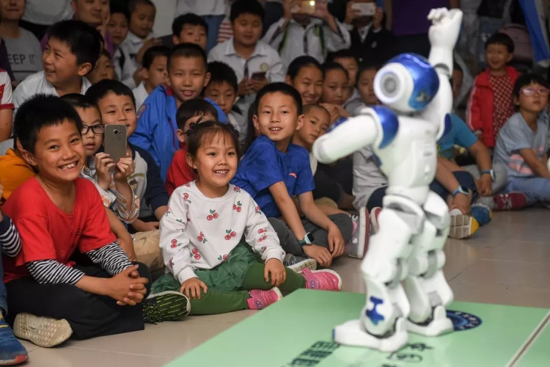 小朋友们在位于安徽合肥的中科大信息科学技术科普点观看智能机器人表演(2018年5月19日摄)。新华社记者 张端 摄