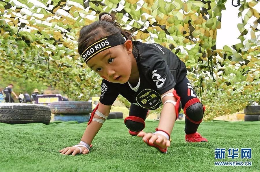 山东烟台,迎“六一”儿童定向障碍竞速赛中,小朋友奋力完成挑战(2019年5月30日摄)。新华社发(孙文潭 摄)