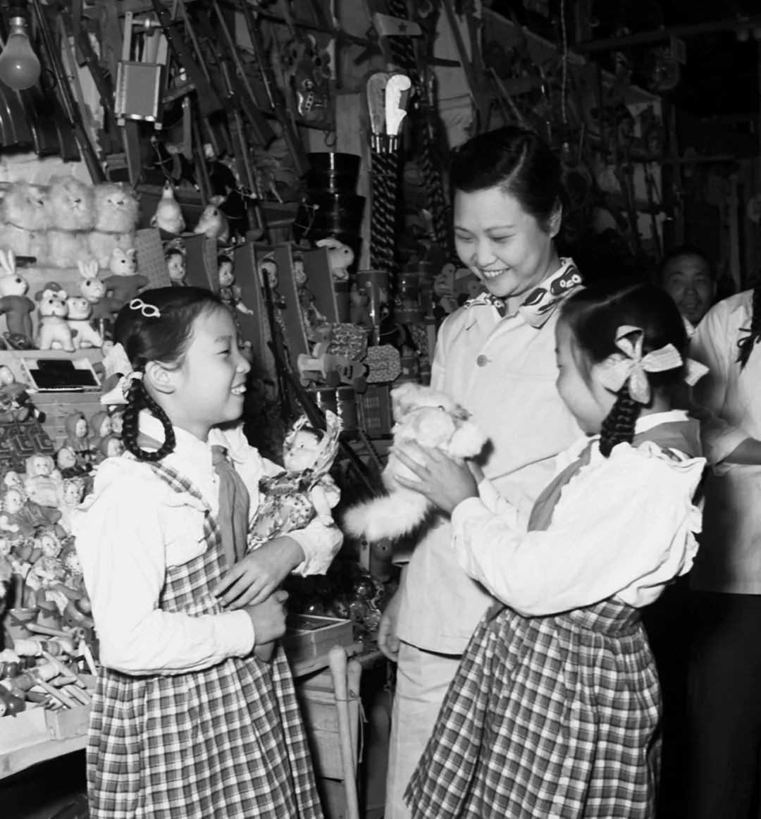 北京一对孪生姐妹随着妈妈在市场上购买“六一”节玩具(1955年6月1日摄)。新华社发(资料照片)