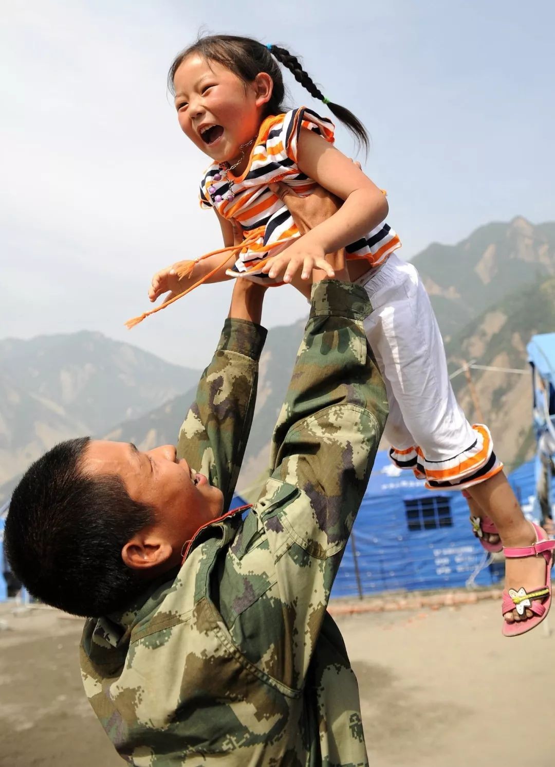 汶川县地震灾区映秀镇,一名参加救援的战士与5岁的杨诺玩耍(2008年6月1日摄)。新华社记者 蔺以光 摄