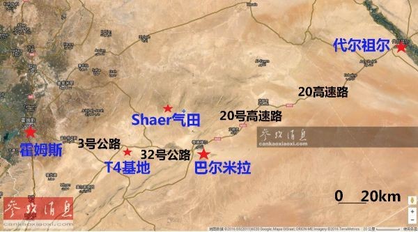 此外,距T4基地东北约50公里处就是叙利亚的重要天然气产区Shaer气田所在地。围绕这座财富源泉,从2014年7月至今,叙政府军与IS至少爆发过3次大规模战斗(外媒称“3次Shaer气田之战”)。就在不久前的5月早些时候,IS重新夺回了气田控制权,从而对32号公路、20号高速路和T4基地构成了直接威胁。