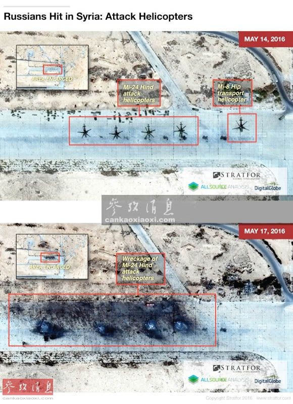可能是因为没人搭理(Amaq网站也因涉恐被封),再之后的10天里上述消息并未见诸于全球主流媒体报端,直到5月24日,美国民间智库STRATFOR(战略预测网)突然曝料,用“数字地球”公司的卫星图片为佐证,分析并得出了俄罗斯米-24攻击直升机在T4基地遭袭被毁的结论。