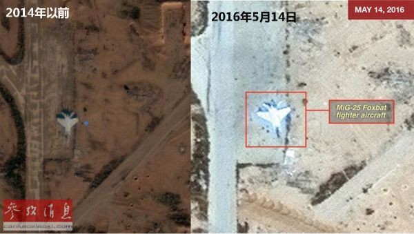 特别是那架在跑道上被打坏右翼的米格-25战斗机,机体仍大部完好,其周边地貌也无遭火箭炮袭击的迹象。而从更早时候的谷歌卫星图片(时间可能在2014年之前)来看,那架米格-25似乎已经孤零零地待在原地达数年之久,而离它不远处的土地上还空置着多架废弃的米格-25和苏-17战机,给人感觉遭袭的这片区域更像是飞机坟场。