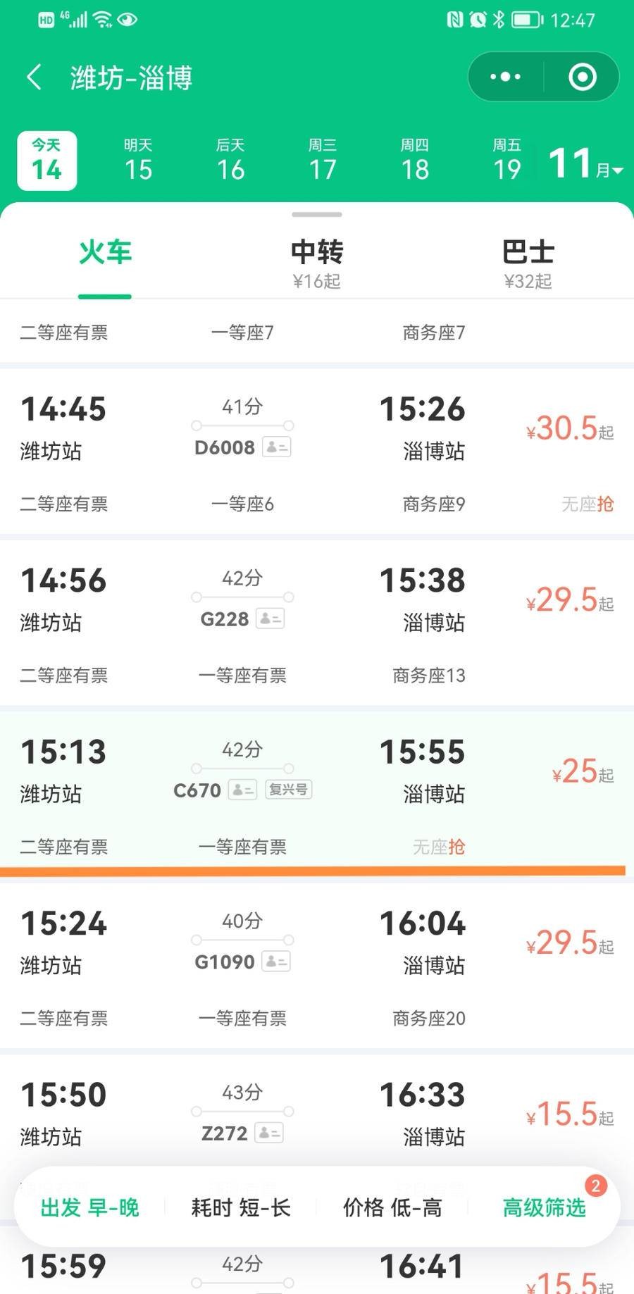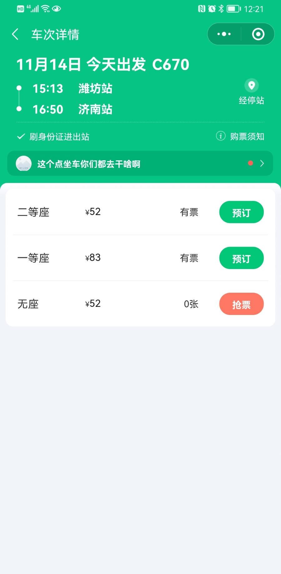 潍坊去淄博、济南都可以乘坐“绿巨人”,票价略低于其他列次动车