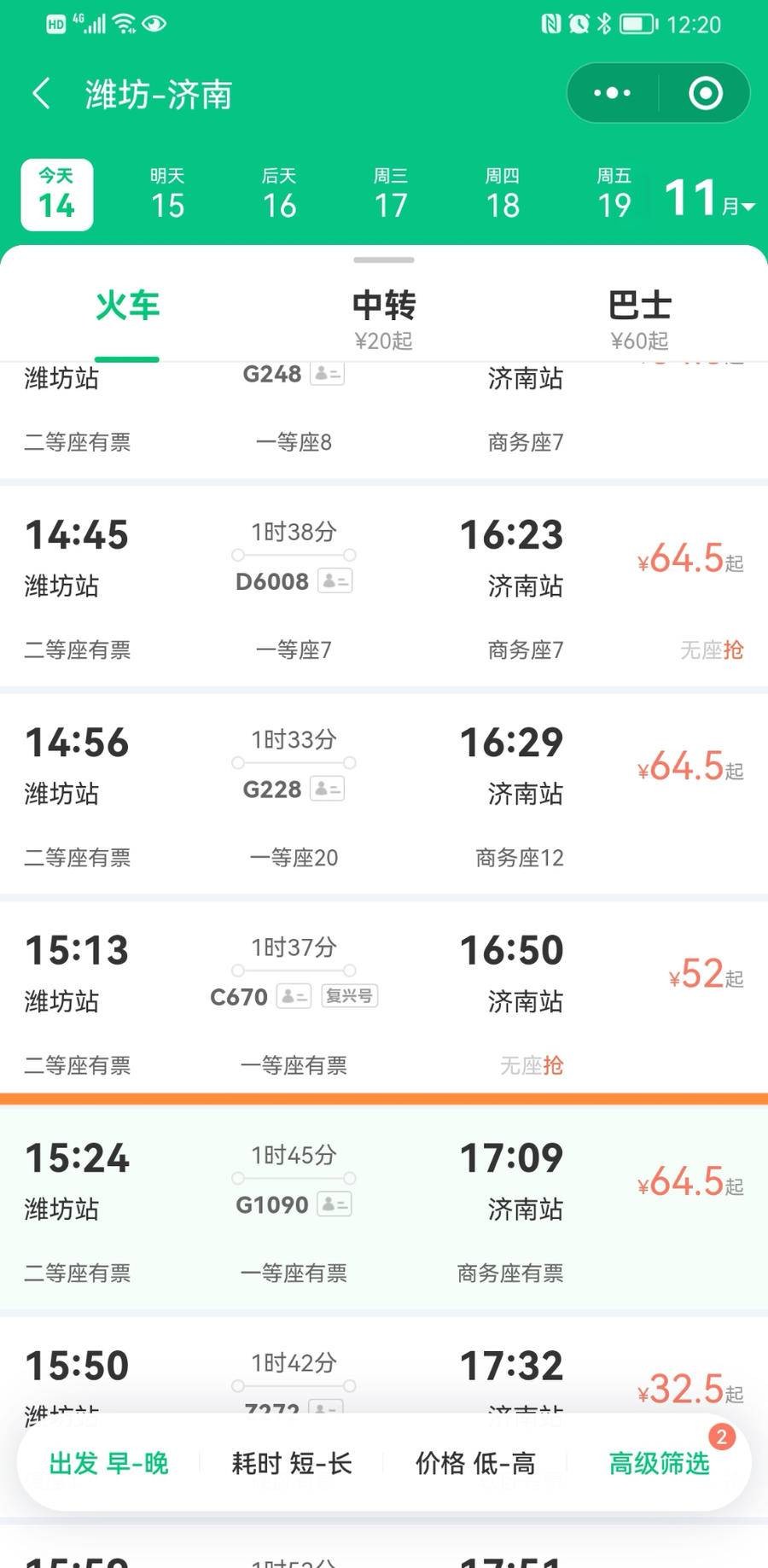 11月12日起,山东省内始发的“绿巨人”动车组在京九、蓝烟、龙烟、新兖、兖石、邯济等普速铁路运行。14日,记者查询发现“绿巨人”动车组中的龙口市至济南C671/0次将会经过潍坊站,15:13从潍坊站出发,15:55到达淄博站,16:50到达济南站,票价略低于其他列次的动车。