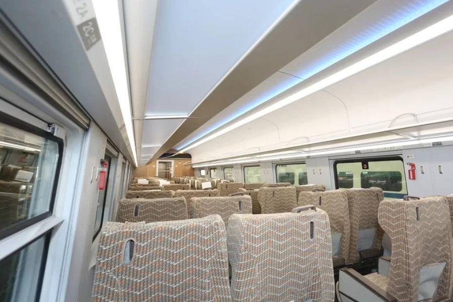 据介绍,“绿巨人”动车组内饰环境全面提升,多种设施参照复兴号高铁标准进行设计,列车座椅席位间距加大,车厢内全部采用LED照明,行李架处设有辅助灯带,内部环境宽敞明亮。提供多项人性化设施服务,列车设餐吧区,在走廊、座位、洗手台等处设有电源插头,方便旅客随时充电,同时提供Wi-Fi服务。为更好服务特殊旅客,列车设有无障碍卫生间及轮椅存放区,并在座椅、卫生间提供一键呼叫应急服务,为旅客提供品质化出行体验。