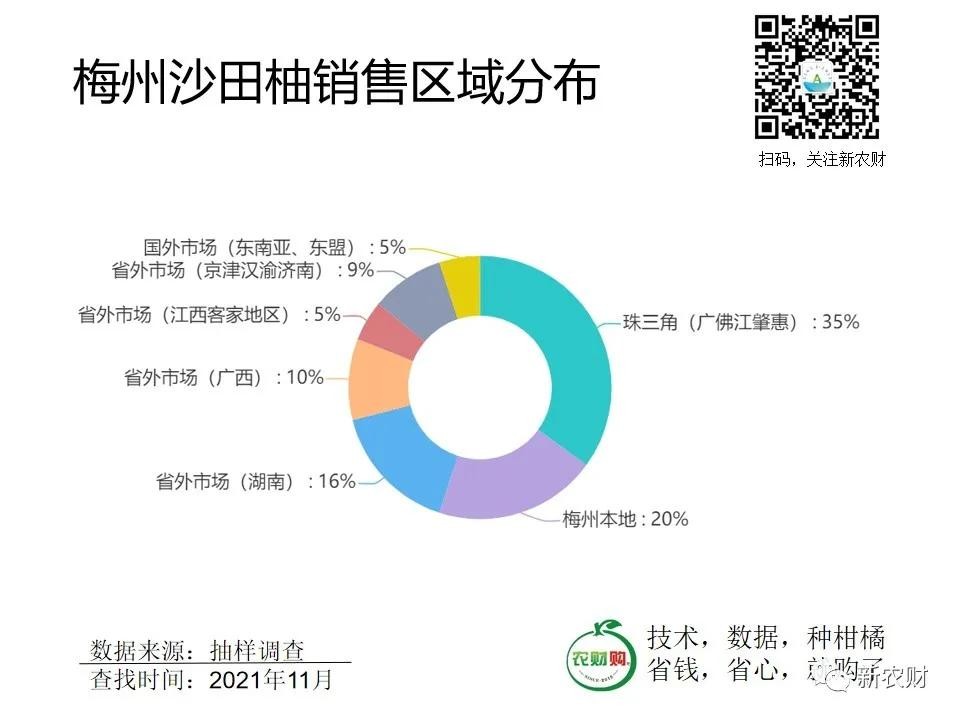 根据上述抽样调查数据,广东沙田柚的消费市场就在本省,而新农财所调查的部分电商渠道销售数据显示,梅县沙田柚的线上订单也主要集中广东地区,占比高达70%以上。