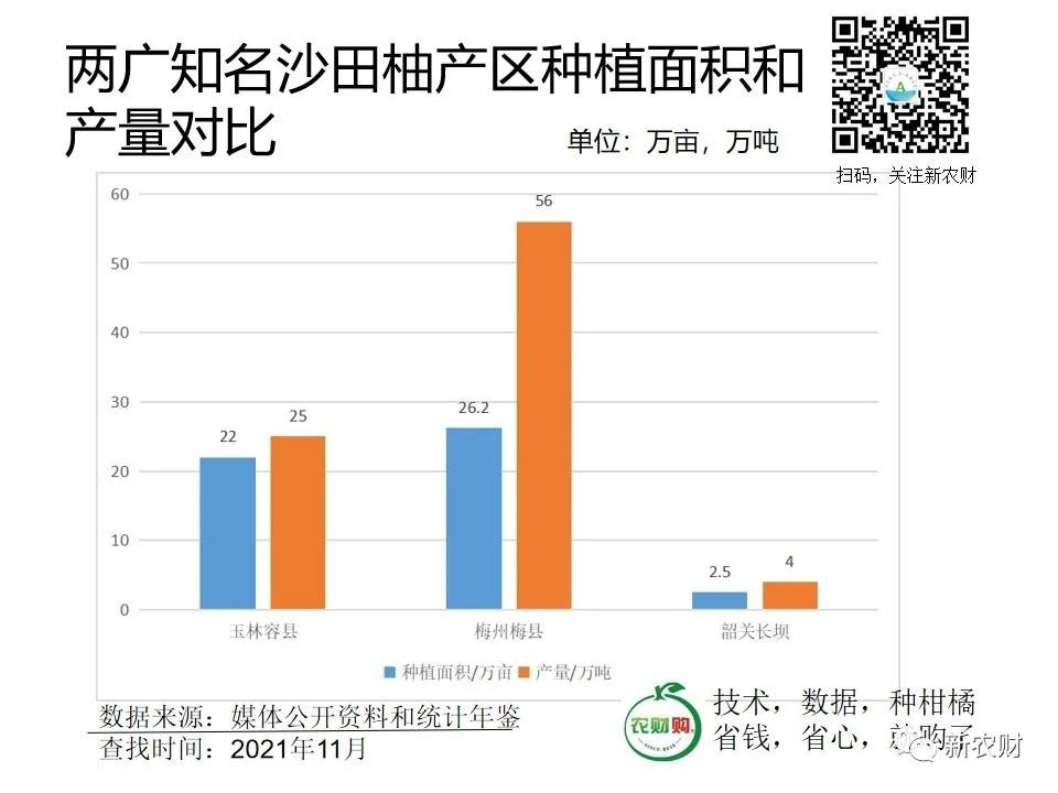 相对来说,广东的沙田柚产量更加集中,据媒体公开报道数据,2021年梅县区正式投产的金柚种植面积达26.2万亩,预计产量约56万吨。而韶关地区知名的长坝沙田柚种植面积达2.5万亩,年产量逾4万吨,合计也超过了60万吨。