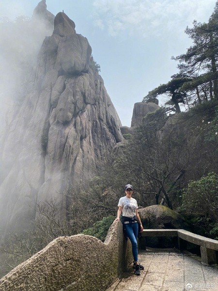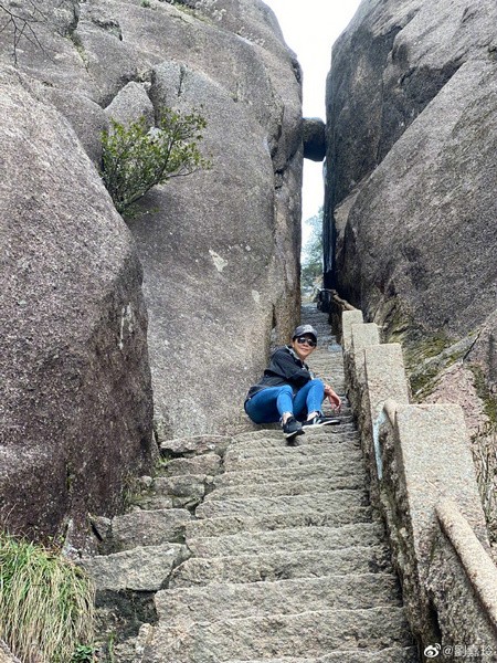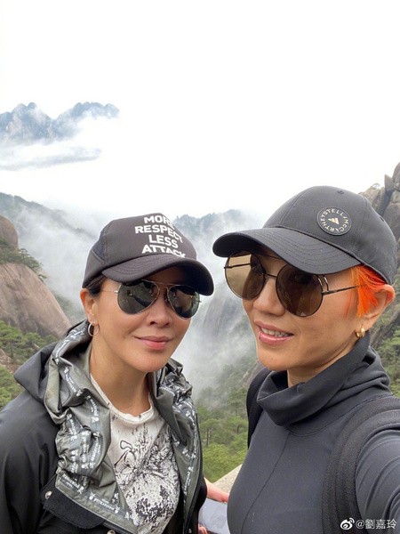 55岁刘嘉玲爬黄山晒美照 素颜脸泛红光状态好