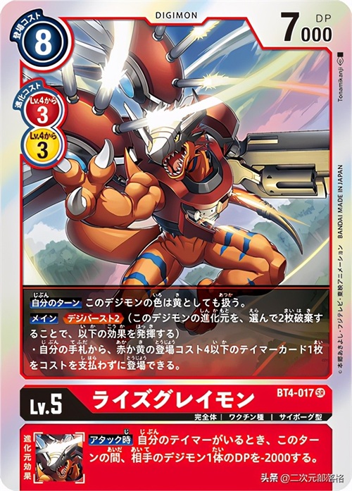 跃升暴龙兽再进化上去就是闪光暴龙兽了,跟正常人类体型相近的战斗暴龙兽相比,跃升暴龙兽的体型更加巨大,据说是积蓄炽热太阳能量战斗的光龙型数码兽,体型巨大的同时也有较强破坏力,必杀技是“辉煌爆破”就是张开巨大翅膀将光之能力集中到极限攻向对方,即便是究极体级别数码兽被正面命中,也会受到重创。