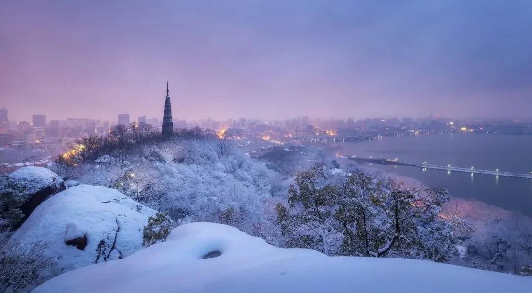 灵隐寺中看雪景,宝石山上赏雪湖。