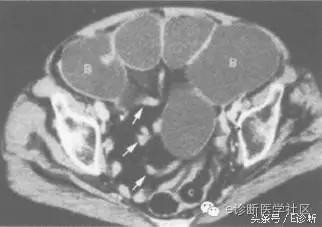 讨论:肠梗阻的病因复杂多样,如肠粘连、原发或继发性肿瘤、克罗恩病、血管性疾病、寄生虫、胆石、粪块、腹部疝、慢性结肠憩室炎、肠套叠、肠扭转等。对于临床不能明确是否存在肠梗阻或不全梗阻的病例,可采取口服2%~4%含碘造影剂的方法,以患者能耐受为标准,口服造影剂量1000~1500ml,分2次或3次服下,2~3h后扫描。当肠梗阻发生后,肠腔随着液体和气体的积存而不断增宽,梗阻部位越低、时间越长肠腔扩张越明显,梗阻以下的肠腔萎陷、空虚或仅存少量粪便。CT表现为肠管扩张,管径显著增大,一般小肠扩张其内可见气液平面,也可完全为液体所充盈,肠壁变薄。梗阻远端肠管明显塌陷,梗阻远近端肠管直径的明显差异,是判断肠梗阻部位非常有价值的征象。可将肠梗阻分为单纯机械性肠梗阻、麻痹性肠梗阻和闭襻型肠梗阻。
