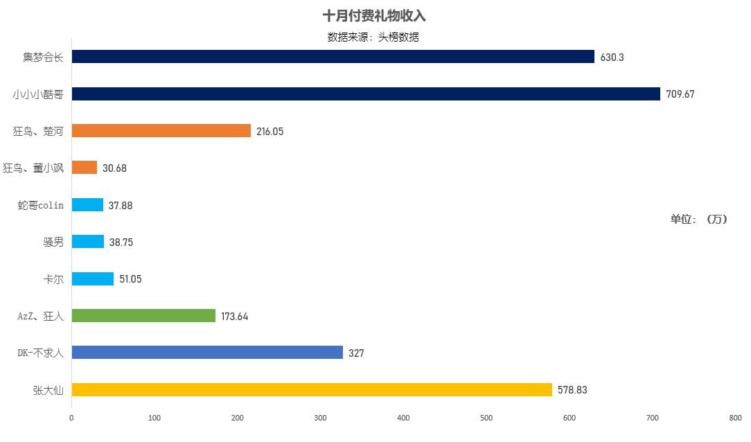 户外的两名主播在十月份的付费礼物收入都在六百万以上,小小小酷哥709.67万全场最高。游戏主播中最高的张大仙578.83万。英雄联盟的三位主播礼物收入均衡,但与其它分区对比差距较大。