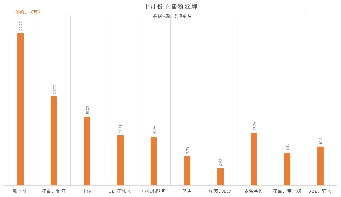 头榜统计到十位主播在十月份的粉丝牌数量,张大仙持续大优势领先,蛇哥的粉丝牌数量在几位主播中较低。在统计时间内,卡尔、张大仙、蛇哥三位主播的粉丝牌流失量在万人次以上,其中卡尔直播间粉丝牌流失最为严重。