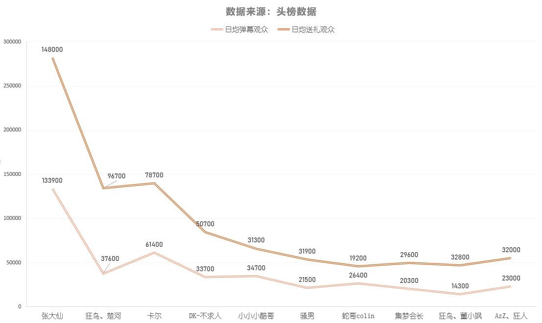 在日均弹幕观众与送礼观众的折线图中,送礼观众的折线图全程凌驾于弹幕观众上,侧面展现出十位主播与超高人气相符的吸金能力。在其余主播保持两项数据在万以内差距时,人气排行第二名的楚河,送礼观众人数却高出弹幕观众近六万人次,这也足以论证楚河在虎牙平台的强大的粉丝黏性与影响力。