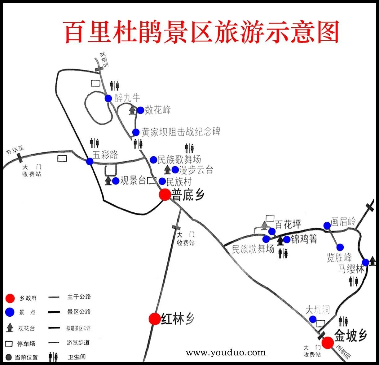 百里杜鹃风景名胜区属于暖温带湿润季风气候,属于典型的喀斯特发育地貌。以大方县境的黄平十里杜鹃林为最典型。每当春夏季节,尤其是四月份盛花时期,从金坡到普底,方圆百里,满山遍野杜鹃花开,五彩斑斓,如云霞飘覆,形成一片花的海洋。