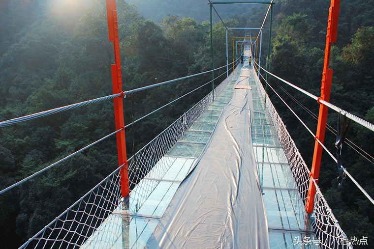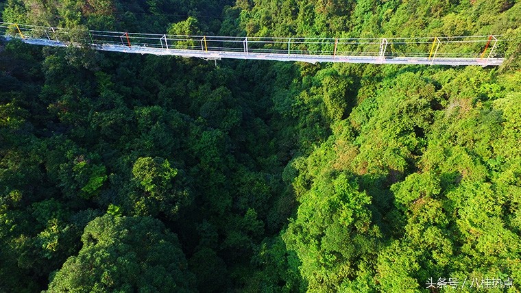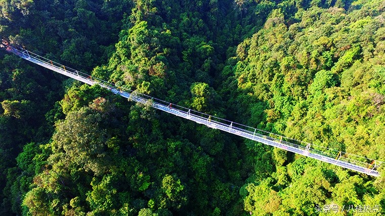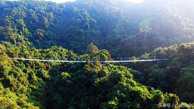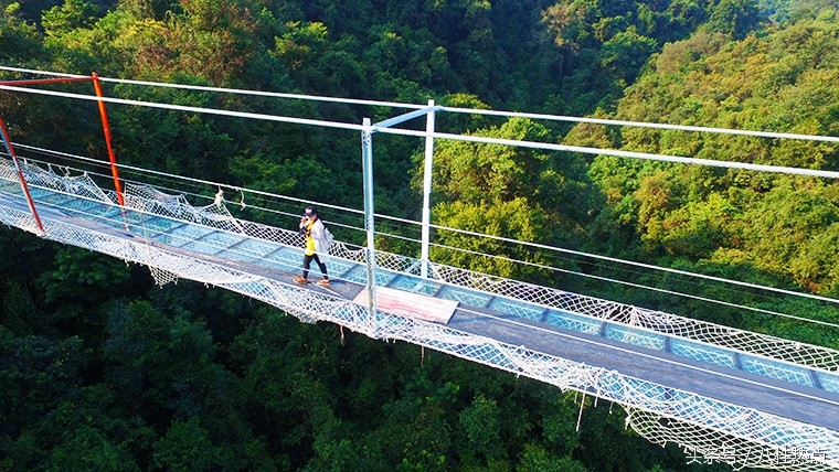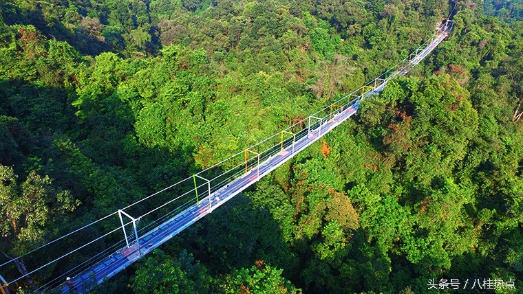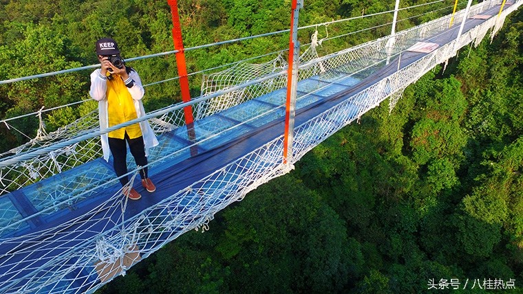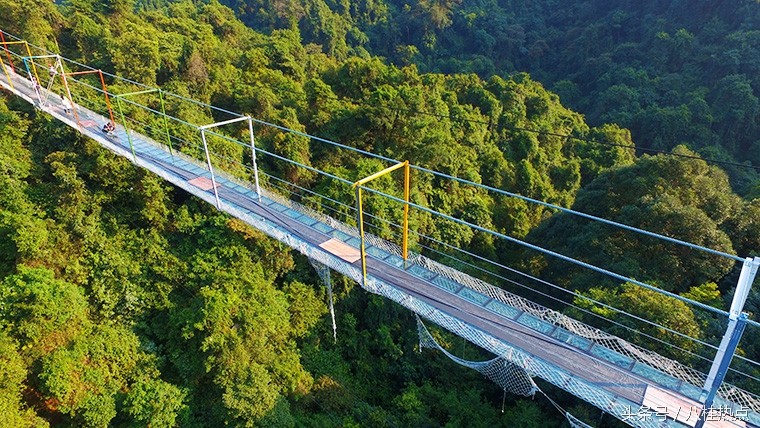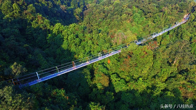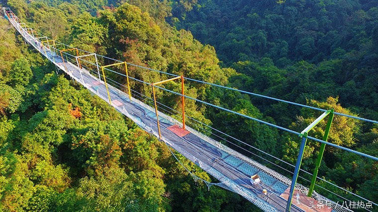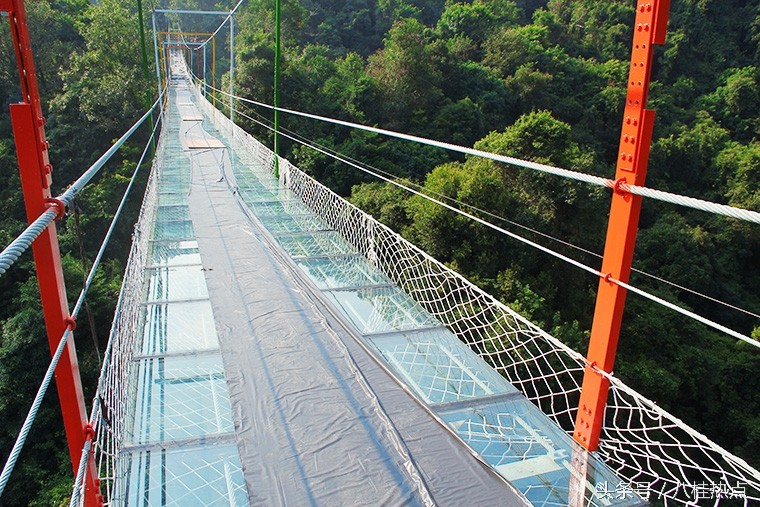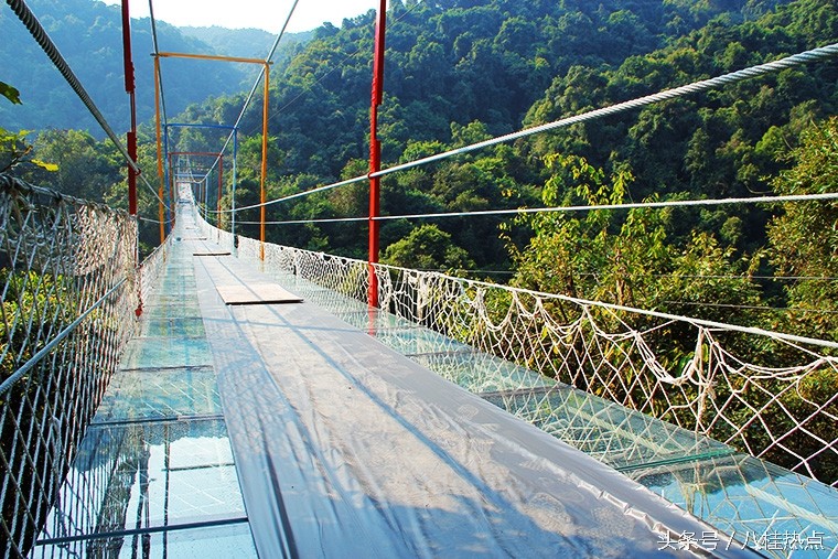 据悉,这是目前广西首座玻璃悬索桥,整座桥由钢绳及玻璃构造,飞架在双龙沟原始森林中。游客走上玻璃悬索桥可体验在数十米的高空中悬空站立,与国内其他玻璃栈道不同的是,由于这是悬索桥结构,并不是固定不动的,所以当多人走上去时,将会出现上下左右的摇摆晃动,加之桥面为全透明玻璃,更让人胆战心惊,与玻璃栈道感受会截然不同,这也是玻璃悬索桥的亮点所在。