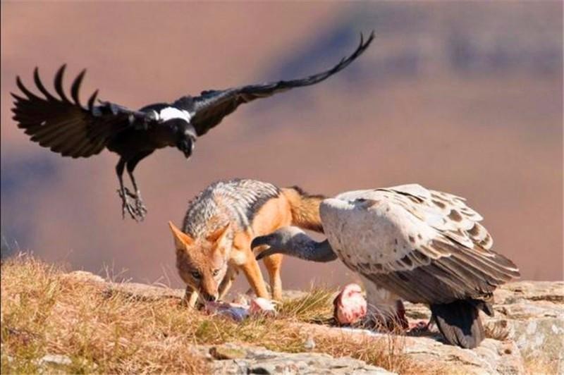 胡狼个小,但是它的胆大、凶狠、狡猾,时常躲在一旁暗中观察野兽猛禽厮杀,待战斗结束后,它会上前去抢食,并不是单纯的吃瓜群众。有时看到狮子成功抓到猎物,它们还会瞄准时机上前蹭个饭,时不时地从狮子嘴边悄悄地叼走一两块肉,丝毫不把狮子放在眼里。