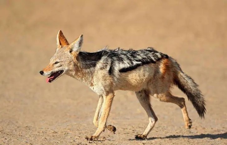 胡狼属于犬科,外形比较独特,既像狼又像狐狸,在外形上和豺十分相像,它们长长的嘴巴相对于一般的狼来说看起来要窄长一些,身上的毛发呈现黄棕色并夹带黑色,其中整个背部皆为黑色的皮毛,这和蜜獾的“白披风”形成鲜明对比。