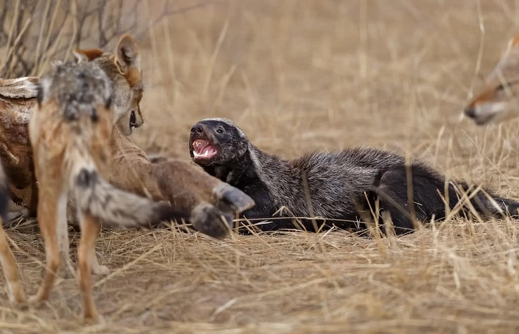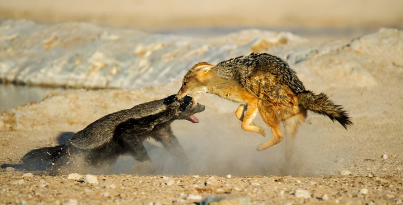 而胡狼最喜欢干的事就是去寻找蜜獾的幼崽,将其当作自己的美味餐食,所以二者注定是一对死对头。不过胡狼体型小,更加灵活,碰到蛮横的平头哥,它总能躲开攻击并搞偷袭,而单打独斗惯了的蜜獾,面对结伴而行的胡狼总是心有余而力不足,常常被打得落荒而逃。