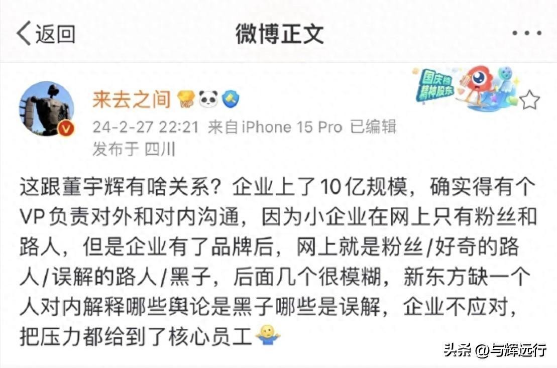 在我看来,俞敏洪被点名批评一点也不冤,就像杜子建老师所说,老俞只是把董宇辉看做是一颗摇钱树,一直在消费他,透支他,却不知道去保护他。偌大的新东方集团没有所谓的公关团队或舆情管理团队,我反正是不信的。上个月董宇辉因反感其频繁莫名其妙上热搜,匹夫之怒下删空微博,微博CEO来总看不下去发文怼新东方,这么大的公司连个对外公关的VP都没有,企业不应对,却把压力都给到了核心员工!