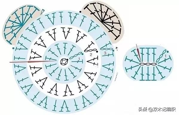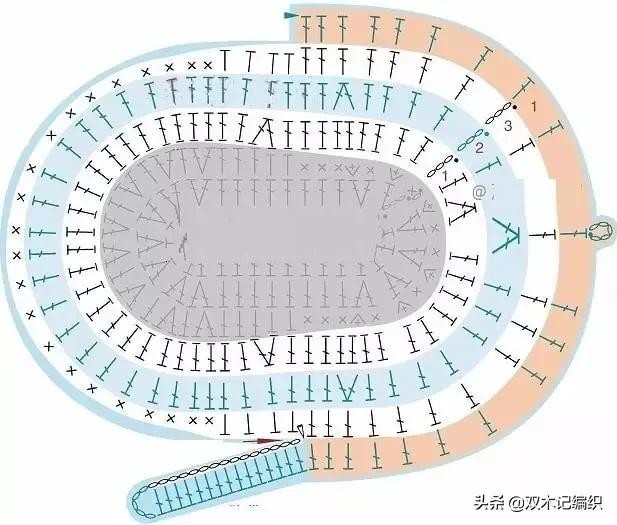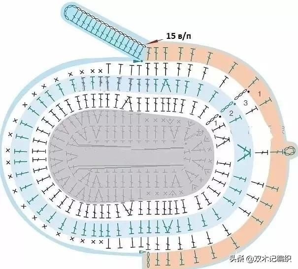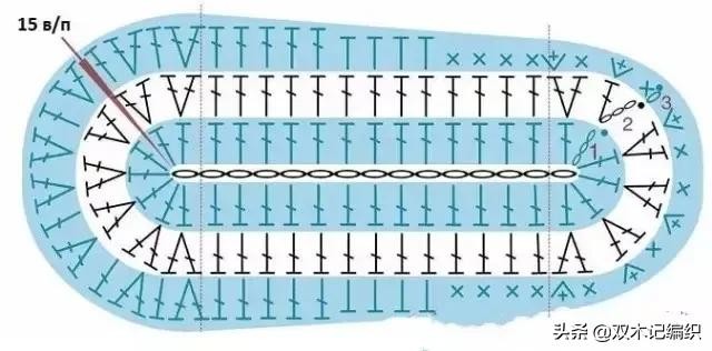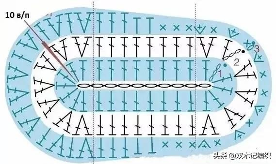 鞋子钩织方案(左和右)适合3个月左右的婴儿,对应上面10个辫子针的鞋底