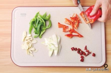 2 大蒜去皮,掰成蒜瓣后切成蒜片;大葱切斜成片;干辣椒切成小段;青尖椒和红尖椒切成小片。