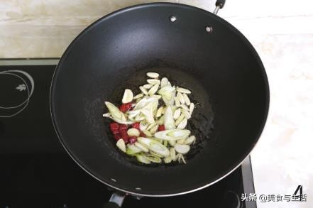 4 锅内倒入油,大火烧至七成热后放入葱片、蒜片和干辣椒段爆炒出香味。