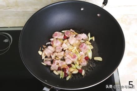 5 放入五花肉大火煸炒,至五花肉颜色变白,油脂逼出。
