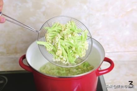 3 锅中加适量清水,水开后放入菜花焯1分钟左右,捞出后过凉开水后控干水分。